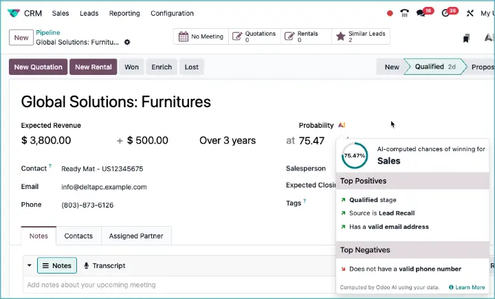Odoo now applies predictions of leads won or lost consistently throughout the CRM system. This improves the quality of your sales pipeline and allows you to work with more realistic expectations.