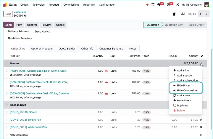 Quotes in Odoo now look instantly professional thanks to new standard headers and footers. You no longer have to add these manually each time, allowing you to send quotes faster and providing a more consistent look to customers.